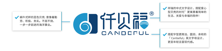 品牌識別的嶄新設(shè)計以「海洋」為主體,商標的主體是福字型 海洋貝殼+中式文字的仟貝福+現(xiàn)代簡約英文Canbeful