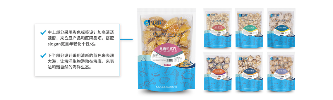包裝的外觀設(shè)計主體為藍色海底色,搭配矢量寫實海洋生物,如同包裝內(nèi)的新鮮海鮮食材 ,傳達著自然、美味、安心的產(chǎn)品特色與信息。中上部的Slogan 凸顯出 專屬 個性化的體驗理念。從中央往外延伸出的雙拼色帶,則以青春,悅動的色彩表現(xiàn),作為各產(chǎn)品系列品項之間的區(qū)隔。